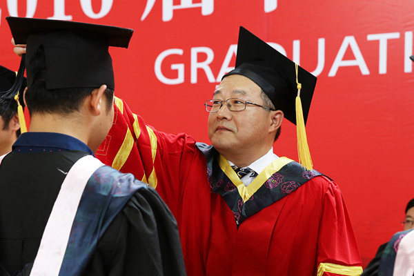 党委书记许继荣等领导为本科毕业生代表、硕士毕业生代表拨穗并颁发学位证书。