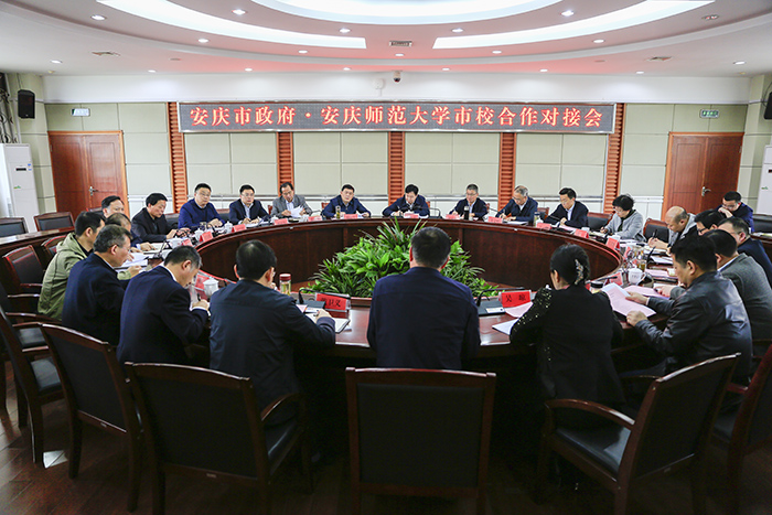 4月28日上午,安庆市委常委、组织部部长胡红兵,市政协副主席、市财政局局长何家虎,市政府副秘书长胡海生一行14人来校洽谈深度开展校地合作事宜。校长闵永新接待了胡红兵一行,并主持召开校市合作对接座谈会。