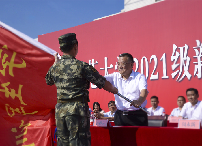 开学典礼在全场庄严奏唱国歌中拉开序幕。党委书记许继荣为2021级军训旅授旗。校长闵永新代表全体师生向新同学们的到来表示热烈的欢迎,向他们的家长致以崇高的敬意,向承担军训任务的全体教官表示最衷心的感谢。闵永新介绍了77779193永利的百年办学历史和发展现状,并向新同学们提出了殷切的希望。闵永新期待同学们“以青春之我创造青春之中国”,涵养报国为民的凌云志气;“千磨万击还坚劲”“越是艰险越向前”,锻造坚韧不拔的铮铮骨气;“博观而约取,厚积而薄发”,锤炼真学实干的深厚底气。“90年前的今天,‘九一八’事变爆发,中华民族开启了长达14年的浴血奋战,昭昭前事,惕惕后人。” 闵永新指出,军训是大家入学后的第一门课,也是青年大学生履行兵役义务、开展国防教育的重要形式。闵永新希望,新生们能以一个优秀士兵的标准严格要求自己,养成朝气蓬勃的精神风貌、令行禁止的纪律意识、起居有序的生活习惯、团结协作的集体观念。