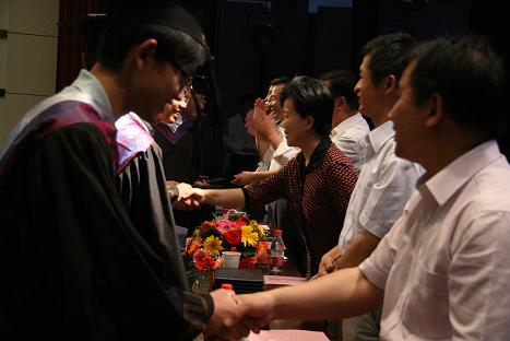 仪式上,领导们为2010届毕业生代表扶正流苏、颁发毕业证书并合影留念。