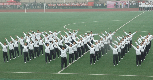 在体育系学生进行的搏击操表演后,14个院系的学生代表队进行的广播操比赛中,外国语学院和人文与社会学院代表队获得一等奖,数学与计算科学学院和文学院获得二等奖,艺术学院和生命科学系代表队分获三等奖。 (钱敏 陈广)
