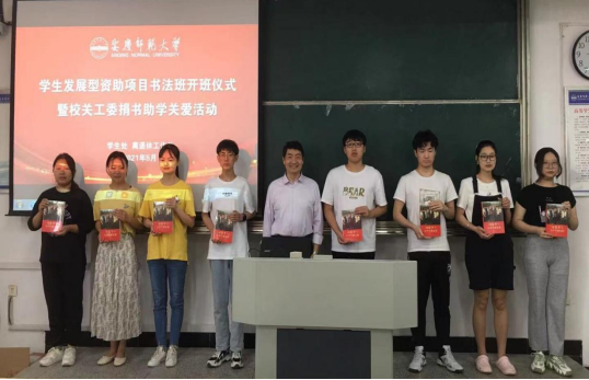 为进一步推进“发展型资助育人行动计划”,关心关爱家庭经济困难学生,促进学生的全面发展、成长成才,5月29日,学校举办 “发展型资助项目书法班开班仪式暨校关工委捐书助学关爱活动”,校关工委常务副主任张群,离退休工作处、学生处负责人及书法班50名学生参加了此次活动。