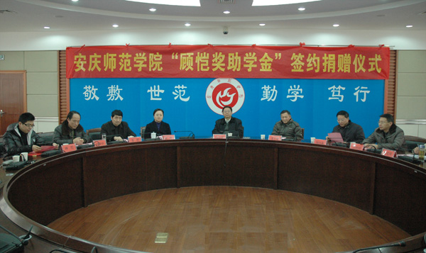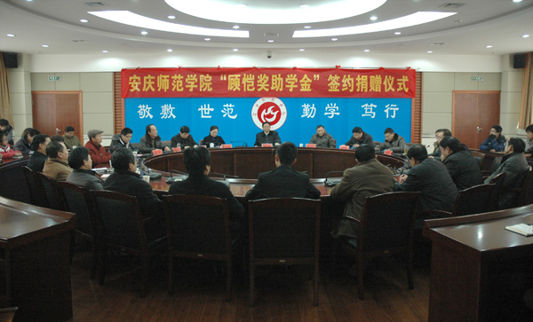 2011年12月31日下午,“顾 恺奖助学金”捐赠签字仪式在永利官网龙山校区行政楼二楼圆桌会议室隆重举行。校党委书记、安庆师范学院校友会顾问何小祥,校党委副书记、院长、安庆师范学院校友会会长朱士群,党委副书记、纪委书记殷红,党委委员、副院长闵永新,党委委员、副院长张群,党委委员、副院长汪时珍,校督导员、安庆师范学院友会常务副会长时新中,党委委员、组织部长陈光明,广东瑞驰佰富投资有限公司董事长顾 恺校友出席了仪式。校友会校内理事、各学院学生代表共50余人参加了仪式。捐赠签字仪式由学生处副处长、校友会副秘书长金文斌主持。
