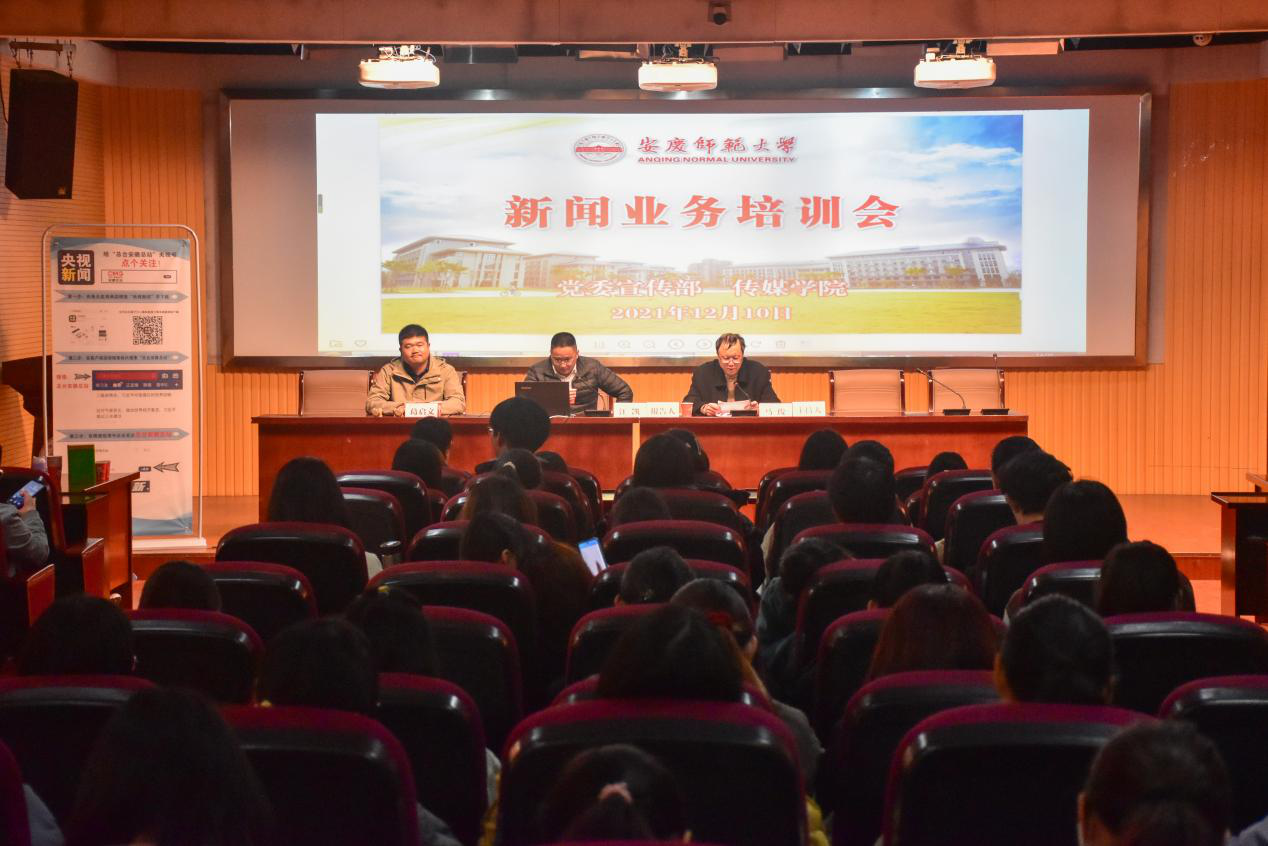 12月10日,中央广播电视台安徽总站记者江凯、葛启文应邀来校开展新闻业务培训。党委宣传部、传媒学院有关负责人与学校大学生记者团、新媒体中心成员、传媒学院部分学生代表共100余人现场聆听了培训讲座。
