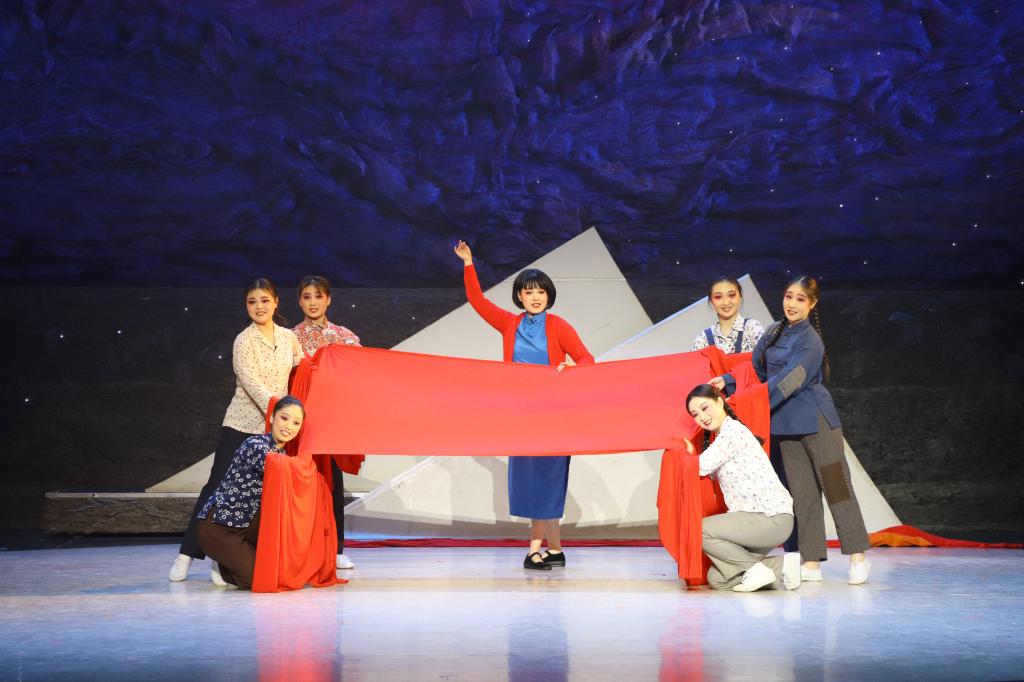随着激昂的音乐响起,“江姐”与6名革命烈士高举五星红旗演绎黄梅歌舞《红梅赞》,仿佛将观众们带回到了那个热血的革命年代……《红梅赞》充分发挥黄梅戏能歌能舞的表现手法和质朴灵动的艺术魅力,以江姐故事为主线,传承弘扬“红梅精神”“红岩精神”,利用戏曲“以歌舞演故事”的艺术手法,聚焦以江姐为代表的老一辈革命烈士的不屈意志和坚定信念,以黄梅戏歌舞的形式让当代大学生重温红色经典,传承革命精神。