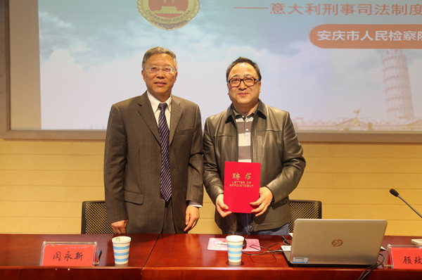 4月11日,安庆市人民检察院检察长顾玫帆应邀到永利官网法律实务大讲堂,以“当东方遇到西方——意大利刑事司法制度的短暂穿越”为题作专题讲座。校长闵永新会见了顾玫帆,向顾玫帆颁发了永利官网兼职教授聘任证书,就进一步加强校检合作与顾玫帆交换了意见。法学院百余名师生参加了讲座。