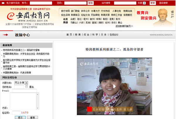 12月24日,安徽教育网以《特岗教师系列报道之二:孤岛的守望者》为题,在教育要闻栏目套红报道了永利官网2010届毕业生张玉娇扎根农村教育的事迹,时长近7分钟。