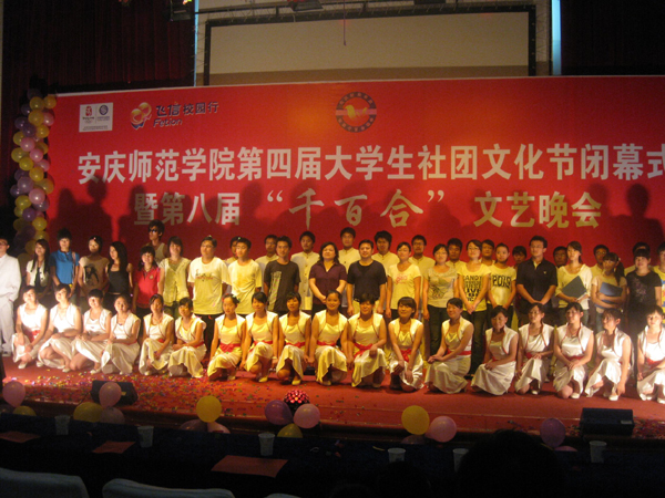 闭幕式结束后,第八届“千百合”社团文艺晚会华丽登场。晚会分为三大篇章:歌舞青春、缤纷社团、花样年华。各社团都推荐了展现本社团特色的节目,有活泼动感的青春健美操、有清新婉转的黄梅戏对唱、有幽默开心的小品、有奇幻震撼的魔术、有生龙活虎的武术、有时尚眩目的街舞……形式新颖、内容丰富的晚会展示了社团人的才华和技艺,更为观众们献上一份开心大餐。