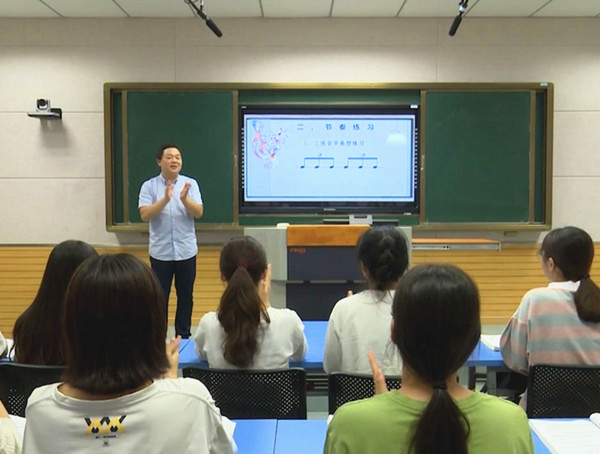 在他的课堂,总能听到同学们热火朝天练习节奏和视唱。特别是节奏律动,需要口唱加双手双脚肢体协调配合,同学们觉得非常有意思,课上课下乐此不疲地练习。