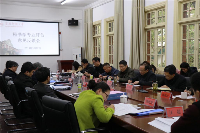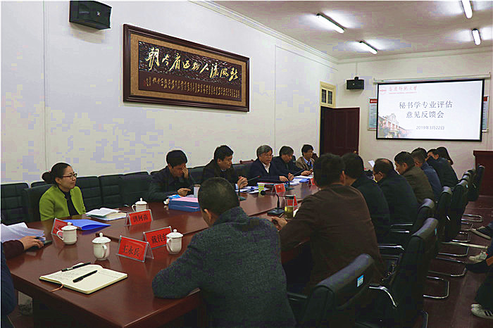 3月22日,由陕西师范大学文学院院长、国务院学科评议组成员张新科教授、南京师范大学文学院院长高峰教授、河南师范大学文学院院长李永贤教授、安徽大学文学院院长吴怀东教授、淮北师范大学文学院院长周有斌教授等组成的安徽省普通本科秘书学专业评估专家组一行6人莅临永利官网,开展秘书学专业评估工作。校党委常委、副校长张群教授,文学院领导班子,教务处、人事处、科研处、学生处等职能部门主要负责人参加了秘书学专业评估意见反馈会。