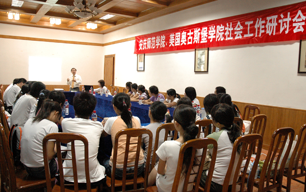 7月25日上午,陈教授在菱湖校区红楼大会议室与永利官网人文与社会学院的部分师生举行了“安庆师范学院、美国奥古斯堡学院社会工作研讨会”。陈教授就社会学中的家庭问题与永利官网师生从不同的方面进行了探讨。陈教授渊博的知识、先进的理念使大家开阔了视野,幽默的谈吐更使会场气氛活跃、掌声不断。