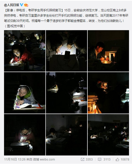 人民日报:停电后,考研学生用手机照明复习