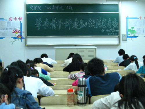 为进一步推进教学评建工作,4月19日晚,文学院团总支学生会组织该院130余名学生干部在教学楼B403和B405开展评建知识抽测工作。此次抽测以闭卷考试为主要形式;试卷内容以《教学评建宣传手册》知识为主,包括文学院的教学管理以及学生工作的相关内容;试卷题型分填空题和主观论述题两种;考试时间为两个小时。整个考场秩序井然,同学们答题认真。