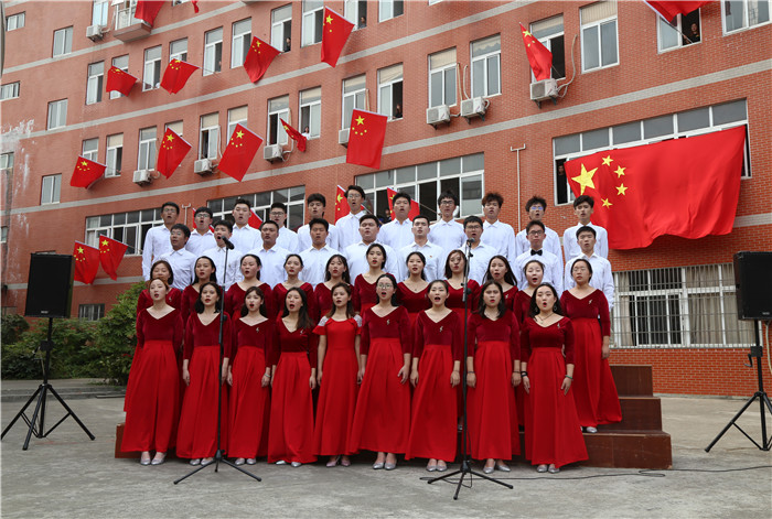 国歌奏毕,悠扬的《歌唱祖国》旋律缓缓响起,艺术楼2至5楼窗外40面3号国旗应声挥舞,迎风招展,蔚为壮观,合唱团的同学们和现场全体师生挥舞着手中的国旗,一起歌唱美丽的祖国。管乐团指挥张老师表示,经过几十次的排练,才得到了这样完美的演出效果,这个过程既提升了同学们的学习能力,也陶冶了爱国情操。