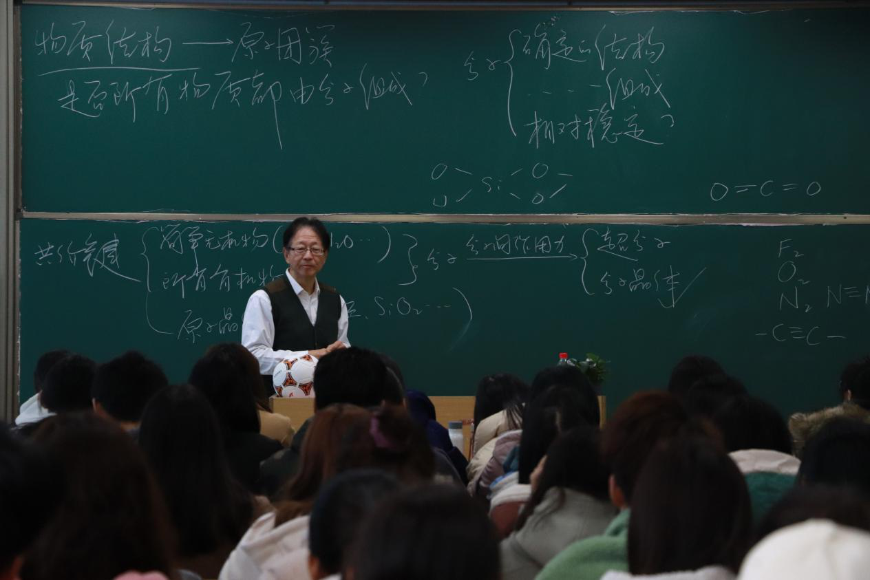 郑兰荪全程板书,通过分子结构、非分子物质的层次和杂化轨道三个部分,给师生们讲解了有关物质结构的知识。他先从“所有的物质都由分子组成”引入,向在座师生说明分子的确定性结构和相对稳定性结构,再从共价键、离子键和金属键拓深到非分子物质——原子团簇。