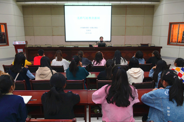“作为学生记者或通讯员,担任着学校新闻宣传工作的任务,一定要知道社会媒体需要什么样的新闻?”方梦宇引入主题后从“如何找新闻”、“如何写新闻”和“从事教育新闻事业写作的一点感想”三方面展开讲述。