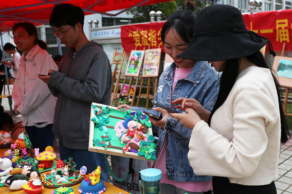 “好可爱啊!”展览现场不断发出这样的感叹,五颜六色的小物件摆放在桌子上吸引了不少同学围观。地理科学专业2018(3)班的刘娇乔买了件蜘蛛侠的泥塑,“这些小玩意都很精致,因为我自己比较喜欢漫威系列的周边,所以买了这个雕塑。”