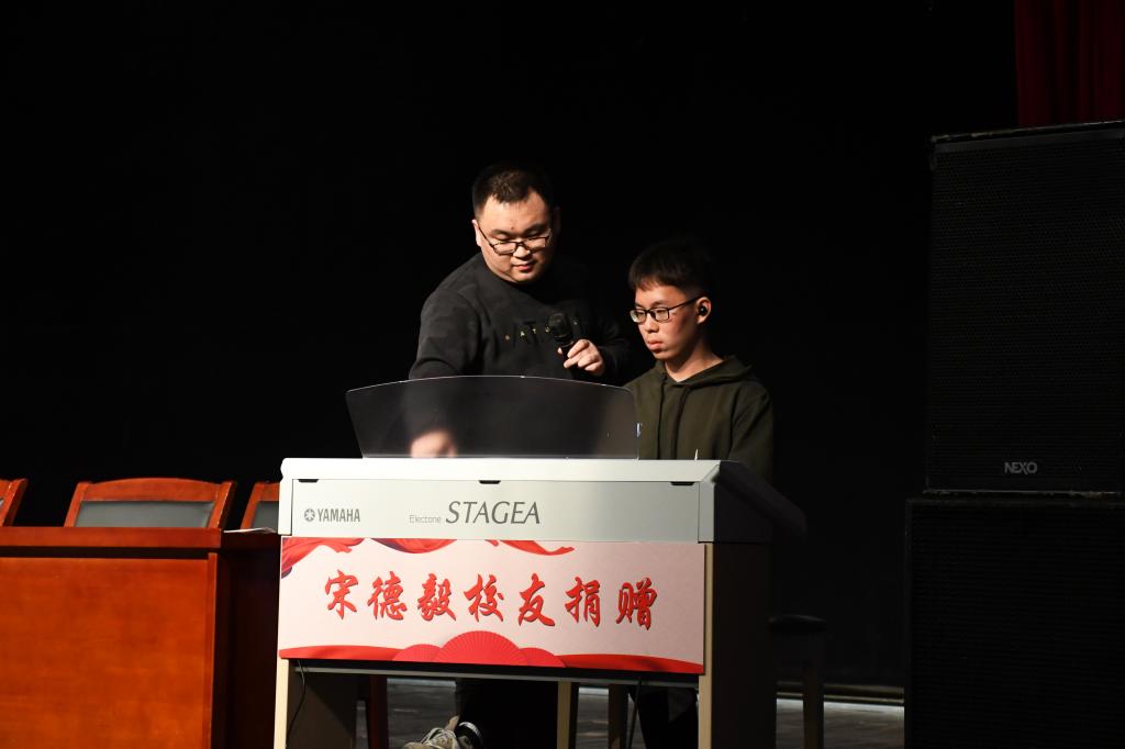该院党总支书记李新建为宋德毅颁发校友捐赠证书后,宋德毅为400余名学生演奏了一曲西游记片头曲《云宫迅音》。一个人、一台琴,没有任何音响设备,宋德毅却演奏出了交响乐团的气势,引得台下学生啧啧称奇,掌声不断。“双排键是一个舞台,能够演奏出一个乐团的效果。希望学弟学妹多去了解学习,有不懂的都可以来问我。”他说。