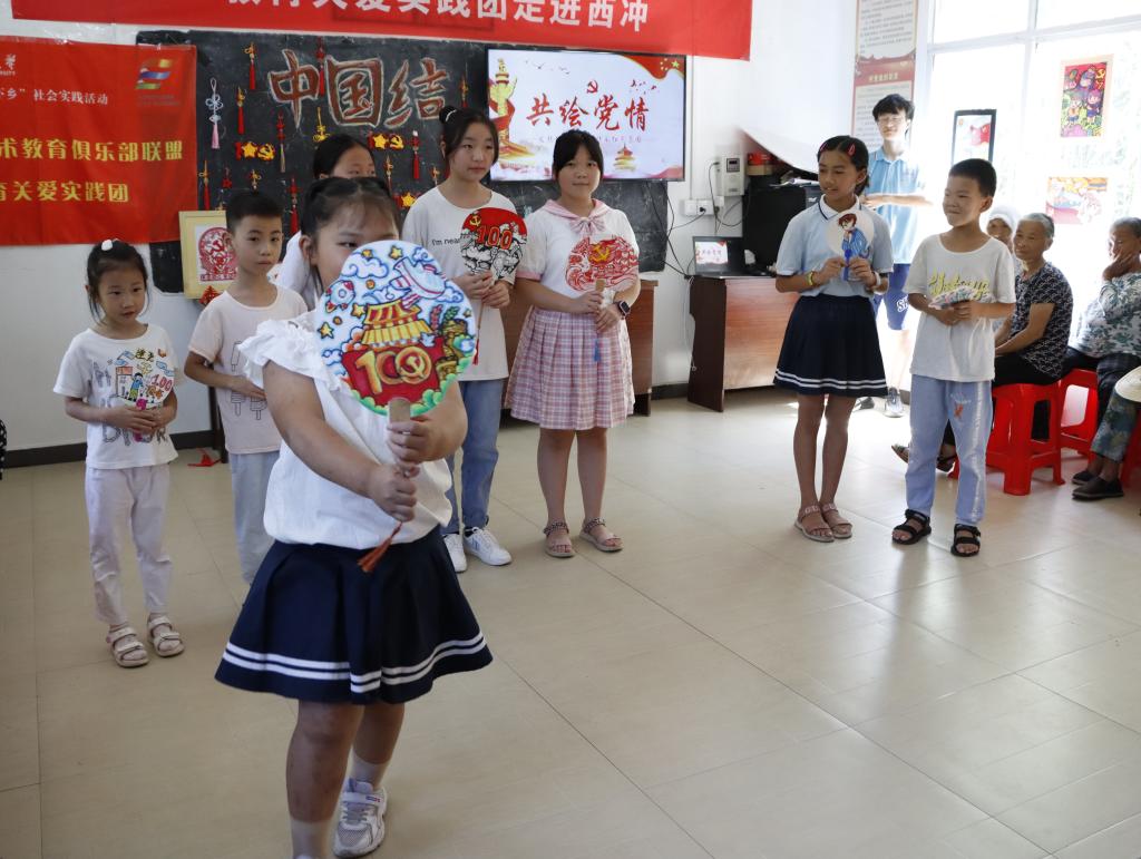 中国结、剪纸、扇画、黏土……在党群活动中心布置的“展厅”内,挂满了以“建党一百周年”为主题的艺术作品。这些集结了党徽、国旗、建党一百周年字样等丰富元素的作品,都出自西冲村留守儿童之手,是十天艺术课堂的成果检验。