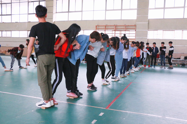 素质拓展活动的主教练张书军老师介绍,“很多游戏都有特殊的意义,比如‘跌倒森林’训练反应和协作,‘从大到小’考察同学们的交流沟通能力,‘空手接金’考验协调性。”