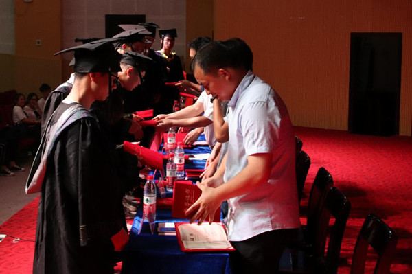 典礼最后,学院党委委员为2015级11个班的88名学生代表颁发了毕业证书,并合影留念。(文/学生记者 邵琪 刘露 图/学生记者 符芳敏)