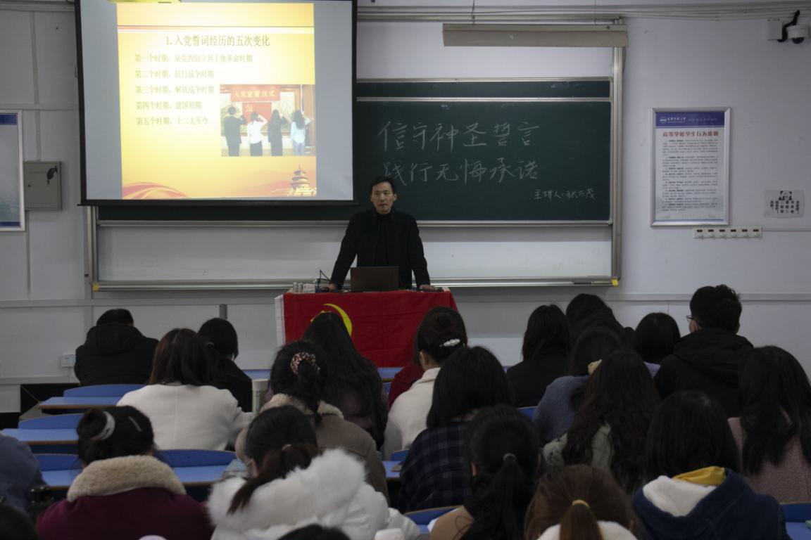 党课最后,张万茂指出,保障党员信守誓言是基层党组织的政治责任。基层党组织要从严把好入口关、教育关和管理关,保证入党动机、思想作风以及党员队伍的纯洁。同时,基层党组织要注重关爱帮扶,破解党员困惑;注重处理问责,遏制歪风邪气。希望全体学生党员必须把入党誓词视为一份政治誓言、一份忠诚承诺、一份责任担当,在日常的学习生活工作中将入党誓词视为共同行动准则,恪守入党誓词,加强党性修养,弘扬优良作风,守初心、担使命、践承诺,以实际行动践行入党誓词,切实发挥先锋模范作用。