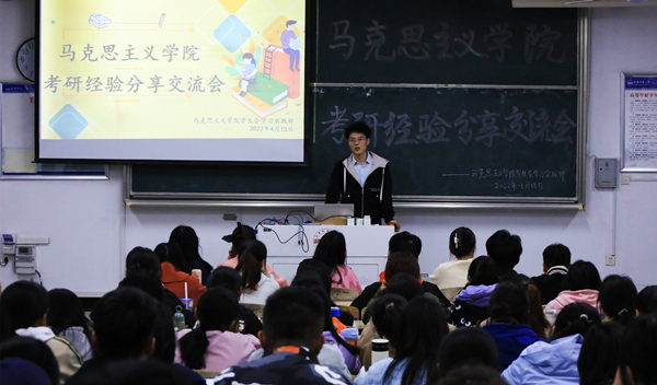 4月15日,马克思主义学院举办考研经验分享交流会,12位2018级优秀应届毕业生现场为学生们进行考研经验分享,该学院相关老师参加分享会。此次分享会采用线上线下相结合的方式,该学院抖音号进行同步直播,共500余人观看本次分享会。