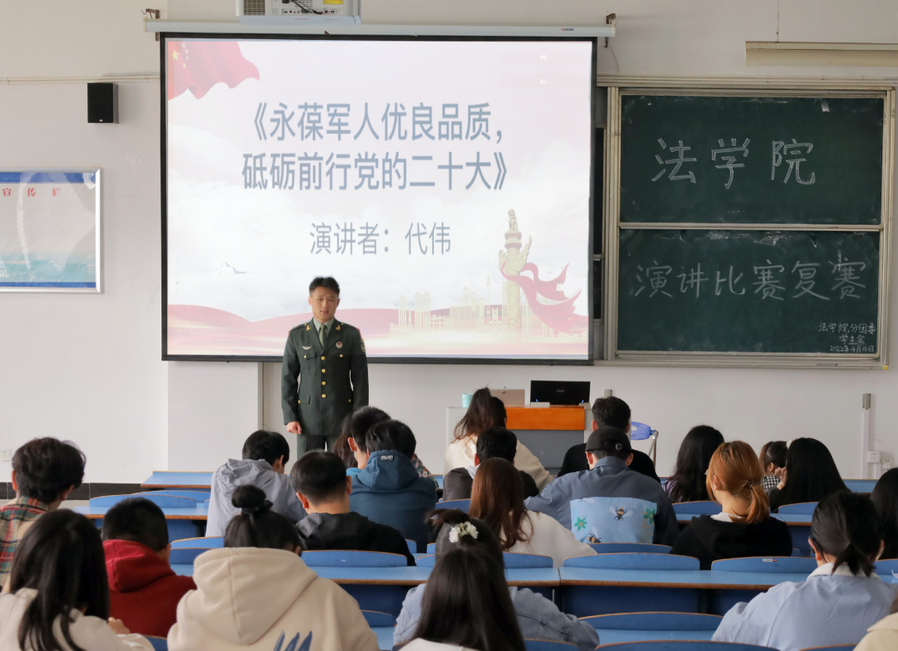 “正是怀揣着对党史军史的崇高敬佩感,我于2019年携笔从戎,参军入伍!”橄榄绿的军装、挺拔的身姿、激昂的语调……法学专业2020级(3)班的代伟一出场便让观众眼前一亮。回忆两年军旅生涯,他用三个“坚”字总结收获:坚持不放弃、坚忍不叫苦、坚决听党话。代伟表示,他会永葆军人优良品质 ,以实际行动彰显新时代青年的使命担当。