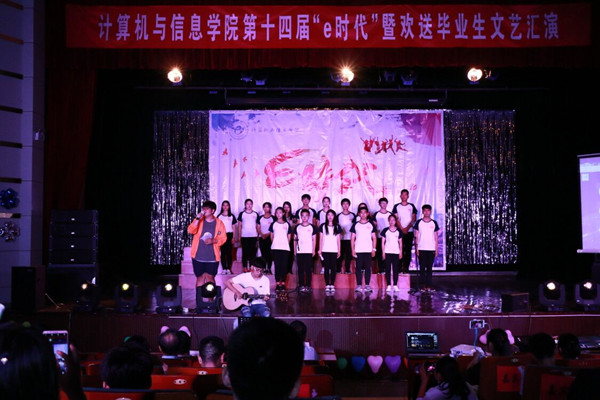 “功成名就不是目的,让自己快乐,这才叫做意义……”5月18日晚上,计算机学院与信息学院第十四届“e时代”毕业生晚会在龙山校区音乐厅举行。校党委常委、教务处处长苏本跃,校团委书记陈东,计算机与信息学院院长王一宾,计算机与信息学院党委副书记江伟以及部分教师代表观看演出。近400人参加本次毕业晚会。