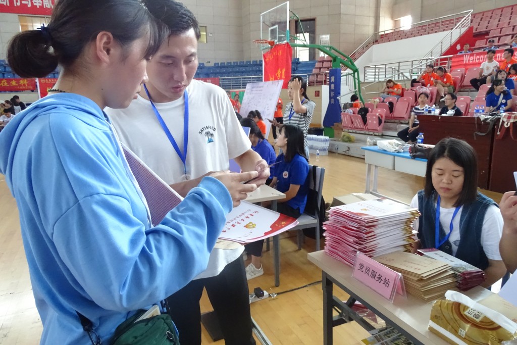 报到当天,现场气氛热烈,虽值天气骄阳似火,但接待热情只增不减。迎新现场,除了设立本科生报到组、研究生报到组接待点外,学院还专门设立了由学生党员志愿者组成的党员服务站接待点,为新生发放《让青春在党旗下飞扬——2019届学生党员青春成长记忆》和《红色基因—入党启蒙》等相关汇编材料,通过入党启蒙教育和优秀党员毕业生的成长经验分享,拉近党组织与他们的距离,鼓励他们坚定理想信念,志存高远,脚踏实地,扣好人生的第一粒扣子,以实际行动在实现伟大中国梦中放飞青春梦想。服务站成员还为新生详细介绍了党的相关理论知识、大学生入党条件、流程等相关问题,让新生对入党程序、入党条件以及学院基层党组织设置有了初步了解。