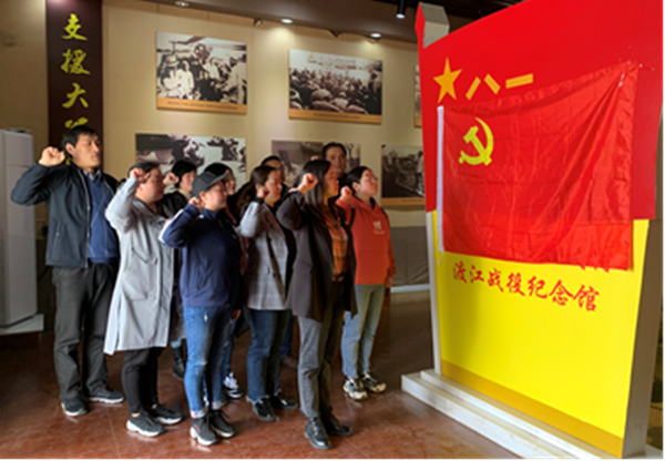 在纪念馆里,大家瞻仰了革命先烈的雕像,倾听了革命先烈的伟大事迹,面对一张张图片、一件件实物,深刻感受到了革命先烈们“打过长江去,解放全中国”,不怕牺牲、无私无畏的英雄气概。参观中,大家了解了漳湖回族船工为渡江战役所做的贡献,了解了“渡江船工光荣证”背后的故事,更深刻理解了党同人民的血肉联系。参观结束后,大家面向鲜红的中国共产党党旗,举起右拳,庄严宣誓,重温入党誓词。