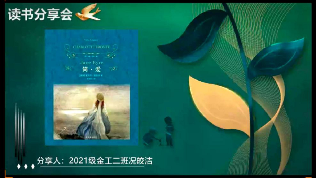 对于金融工程专业2021(2)班的况皎洁来说,从小学三年级第一次读《简∙爱》,再到初中、大学时重读,每一次阅读都带给了况皎洁不一样的感受。因此她想通过读书分享会将这种感受分享给大家:“简∙爱虽置身泥沼,仍向希望前行,她就像一块有裂缝的玻璃花瓶,透过缝隙可以看到七彩的光。”况皎洁表示,希望大家在大学期间要认真学习,都能够通过自己的努力过上想要的生活。
