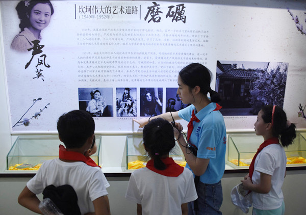 为了让孩子们进一步了解黄梅文化,志愿者带领孩子们参观了严凤英故居。心怀尊敬之情,大家观看了严凤英生前的剧照,对其演绎的各种鲜明性格的人物形象有了深入的了解。“为救李郎离家园,谁料皇榜中状元……”细腻传神的声音从内室传来,投影在墙上的《女驸马》选段视频吸引了大家的眼球。孩子们紧凑在屏幕前,好奇地看着正在放映的表演,有的孩子还伸出手,试图触摸到屏幕上那栩栩如生的人物。以“情”带“声”,声情并茂,唱词圆润生动,吐字清晰,严凤英以真声为主、略参假声、以真带假的演唱让人混淆难分;形神兼备、内外结合的表演让语言与音乐协调统一。