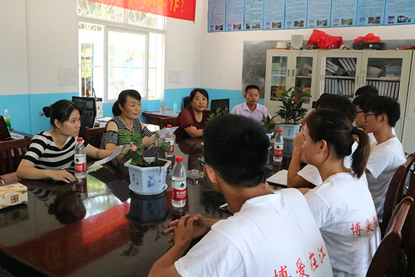 7月18日下午,校团委副书记华秀梅、校团委学生社团联合会指导老师冒着烈日酷暑前往岳西县毛尖山乡鹤林小学,慰问学生社团联合会“情暖童心”关爱留守儿童实践服务团,指导大学生暑期“三下乡”社会实践活动,并与鹤林小学校领导就暑期社会实践活动的开展和持续性发展进行探讨。
