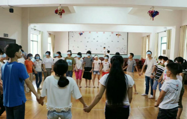 “蟹王蟹后”和“盲人方阵”游戏是素质拓展活动的内容之一,孩子们蒙住眼睛找到地上的绳子并组合在一起,最后一起合作将绳子拉成圆圈形状。孩子们先是自己混乱地摸索,后来慢慢学会了团队合作,最后终于成功地将绳子拉成了一个圆圈。励志助困支教团队的负责人汪思青表示,她们组织了很多有趣的活动,希望孩子们在享受游戏欢乐的同时,更能学会合作,增强自信心。