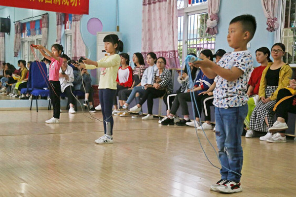 上午九点半左右,天空下起了倾盆大雨,跳绳比赛正在幼儿园的室内活动室里如火如荼地进行。比赛时,小朋友们分组跳绳,见习的“小老师”们则在旁边帮忙计数。在小朋友们完成比赛后,“小老师们”也忍不住回味了一把童年,集体进行了一次跳绳比赛。储家悦笑着说:“孩子是最天真、纯净的。虽然只有短短半天见习的时间,但能跟孩子们在一起,我们也得到了放松。”