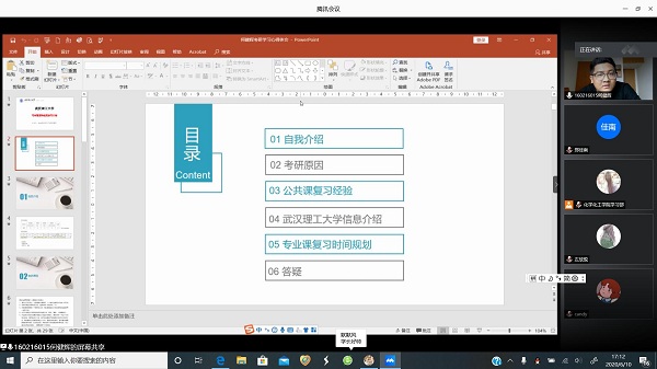 交流会中,九位优秀毕业生代表结合自己的考研经历向同学们分享了考研以来的心路历程,介绍了自己的经验和学习方法。他们认为,考研的成功一定要有正确的方法、不懈的努力、良好的心态以及充分使用好复习资料。他们分别从专业科目、英语、政治和数学四个方面进行详细地剖析,还热情地与留言区的观众进行互动。其中,来自2016级材料化学1班的何建辉制作的考研经验分享PPT,“干货”满满,赢得了同学们的一致热评。他详细地介绍了自己备考武汉理工大学从择校、考试大纲到报名、复习计划以及心态调节等方面的情况,还特别强调了坚持在考研过程中的重要性。