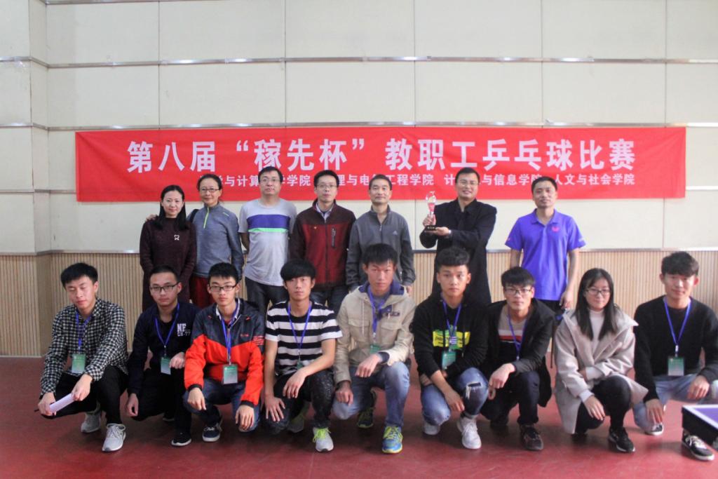 11月15日下午,永利官网第八届 “稼先杯” 乒乓球赛在体育馆举行,数学与计算科学学院、计算机与信息学院、物理与电气工程学院和人文与社会学院教职工代表组队参加,经过多场激烈角逐,最终数学与计算科学学院夺得团体赛的冠军。