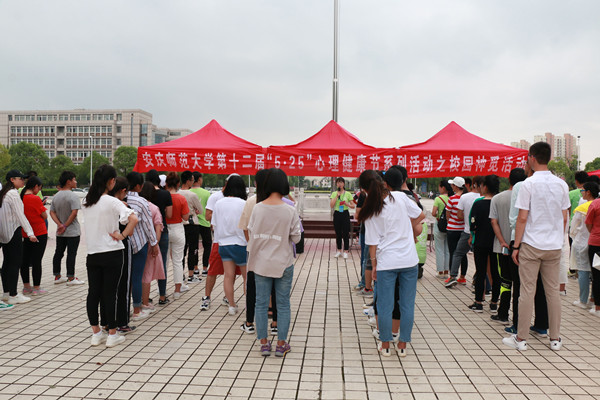 本次活动由三个环节组成。第一环节,各队按照信封里的信息到达指定地点,找到相应物品并完成搜寻游戏,再到达指定地点完成心理知识问答;第二环节,回到敬敷广场并且利用所寻的物品完成“心与心”T恤的DIY;第三环节,在南门操场、图书馆和教育学院楼附近找三位同学试穿上T恤。