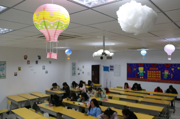 学前教育专业2017(2)班的教室内,天花板悬挂着一个又一个“热气球”和“白云”,搭配着灯光,如同置身于梦幻仙境,“白云”间的热气球,仿佛即刻就要启程开始环游世界。