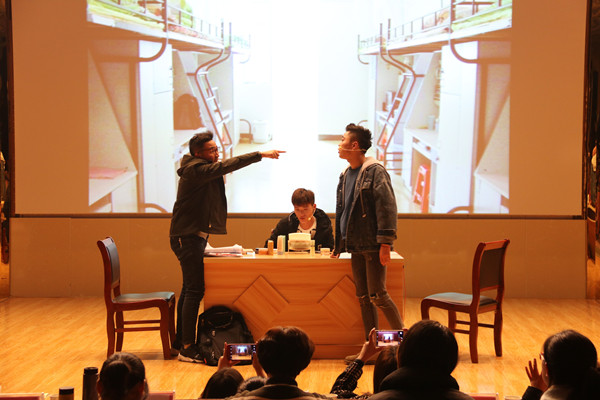 “朋友一生一起走……”三等奖作品《一念天堂》的表演中,演员们一首《朋友》的合唱引起台下观众们打拍配合。视觉传达设计专业2016(1)班的孔德磊为了参加此次表演,放弃了之前报名参加的另一个比赛,他说:“因为两个比赛撞了时间,所以只好放掉了那边的比赛,作为团队的一员,跟大家一起排练了很久,不能让大家的付出白费。”