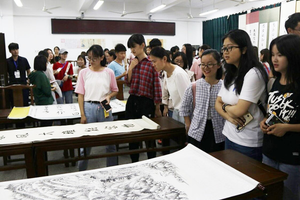 校团委书记陈东在参观此次书画联展时对大学生书画协会荣获2017年“全国优秀大学生国学社团”称号给予肯定。他希望本届“宜城高校”书画联展能够继续将中国传统书画文化发扬光大。(文/学生记者 邵琪 图/学生记者 黄庆 朱羽)
