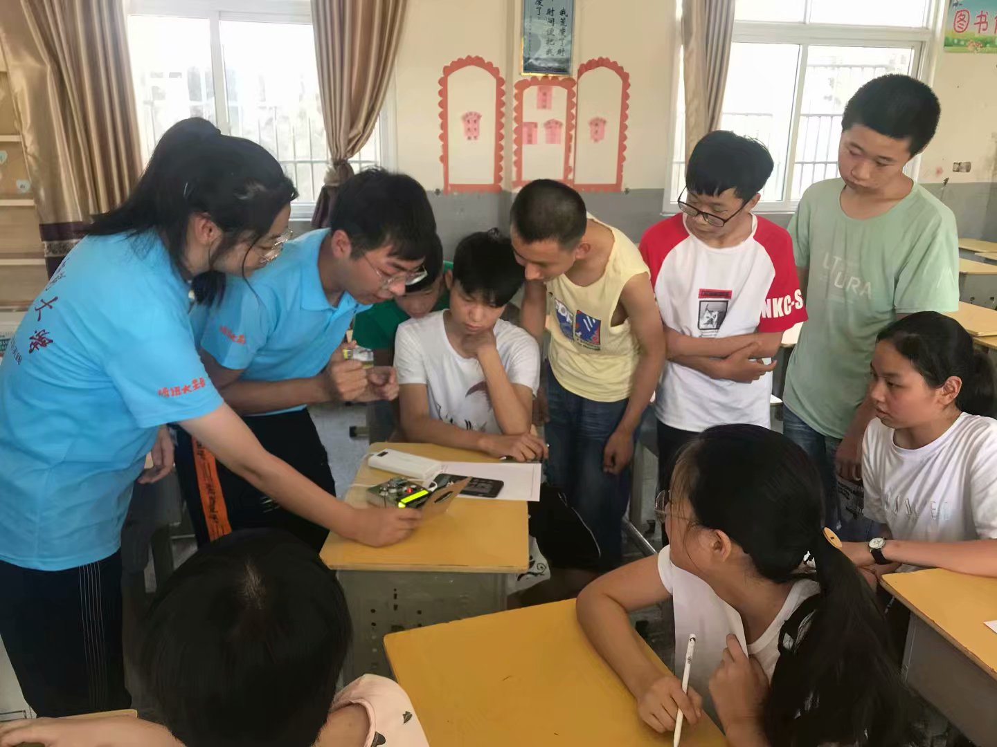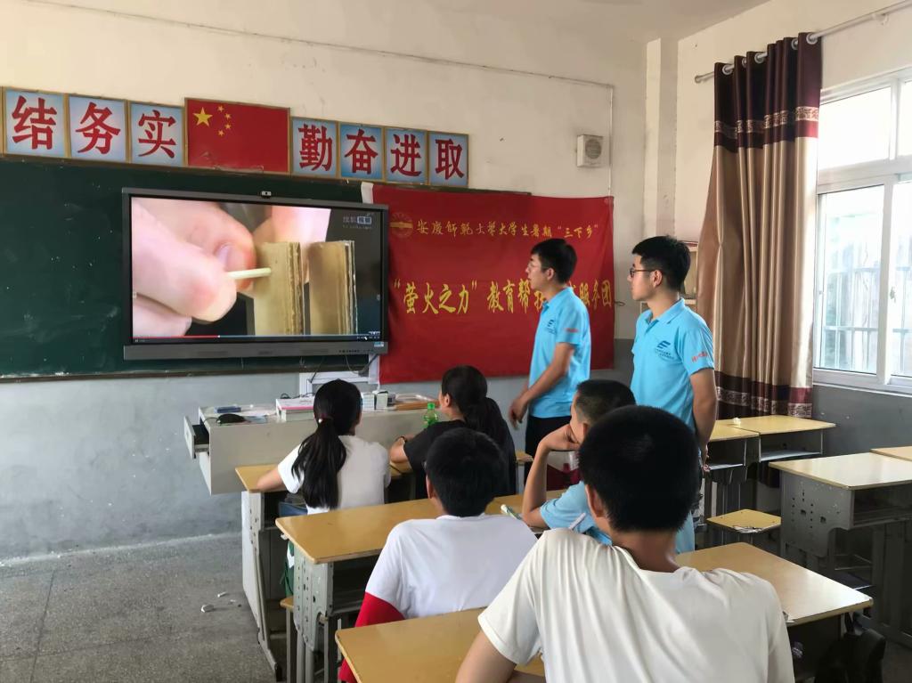 秉承“敬敷世范,勤学笃行”的校训精神,7月19日至25日,在物理与电气工程学院党委的高度重视下,“萤火之力”学生实践服务团队在潜山县源潭镇双峰初级中学开展了为期一周的教育帮扶实践活动。在这里,他们用知识和激情将孩子们的梦想点燃,将希望和快乐进行传递。