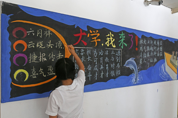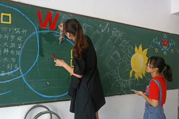 为了能在新生入学前绘制好黑板报,同学们一有时间便会去新生宿舍楼内绘画。“我是和同宿舍的另外两个室友一起负责一幅黑板报的。除了上课,我们课后还有兼职。虽然比较忙,但我们会挤出一切空余时间来完成好绘画的任务。”产品与设计专业2017级的王露露笑着说,她们的画虽然简单,但很用心,每个大字都会有尺子量好比例再画。