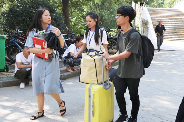 不断擦拭头上的汗,煽动已汗湿的上衣,从上海赶来的外国语学英语(师范)专业2018(1)班的周正独自来到新生处报到。“父母若过来,还要匆匆赶回去。我不想他们太辛苦,就选择自己一个人来。”周正说。在志愿者的帮助下,他顺利完成一切手续,抵达寝室,他感叹道:“终于到寝室了,好在我的东西并不多,要不然我就要累垮了。”刚整顿好,周正就给父母打电话报平安,并为自己的第一次独立之行而感到高兴。