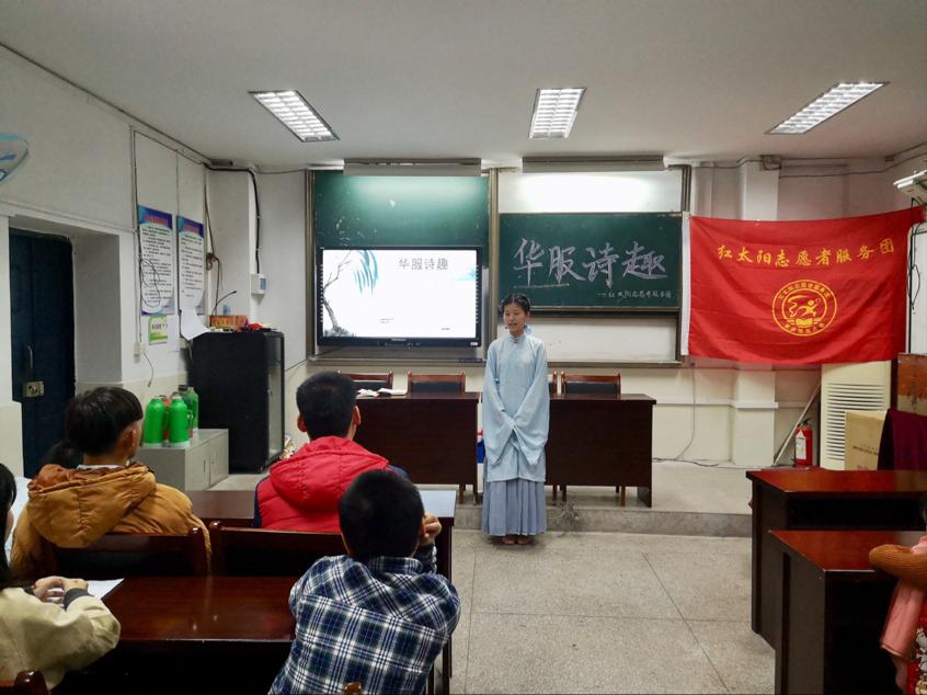 “在这次活动中,我们就是想以汉服和诗歌作为切入点,让孩子们体会到中国传统文化的魅力,在他们的心中播下文化传承的种子,静待花开。”队长倪翔总结说。(洪雨婷 石雨昕)