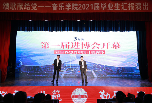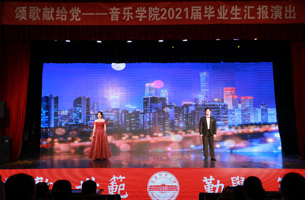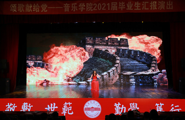 7月2日晚,音乐学院在音乐厅举办“颂歌献给党”2021届毕业生汇报演出,学院党委书记李新建、副书记肖之进、副院长徐冉及部分教师与300余名学生一同观看了演出并欢送2021届毕业生。
