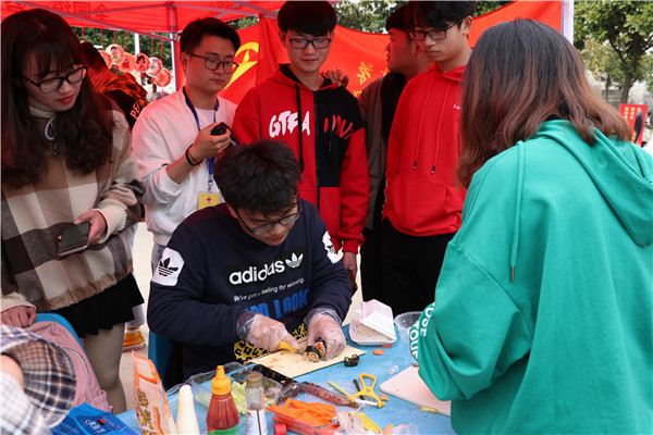 除了色彩缤纷的小玩意吸引前来的同学,5元钱就能DIY自制的寿司也是吸引了不少同学观看。自动化专业2018(2)班的龙旭照趁着这次机会也体验了一次做寿司的感觉,“我是比较享受制作寿司的过程。作为一个“吃货”的我,对于自己做出来的寿司,我觉得更有风味,比在店里买出来的我觉得味道好多了。”