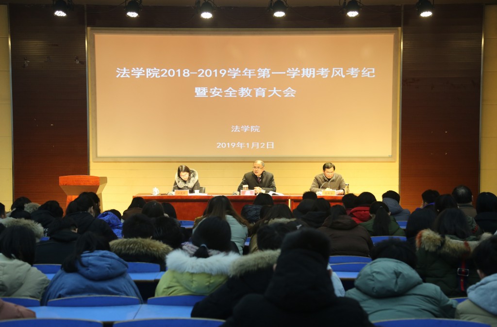 1月2日下午,法学院举行2018-2019学年第一学期考风考纪暨安全教育大会,法学院院长焦少林、党总支书记詹德全、党总支副书记从光梅出席大会,院分团委老师、各班级辅导员以及2018级全体新生、老生班干代表参加了大会。会议由詹德全主持。