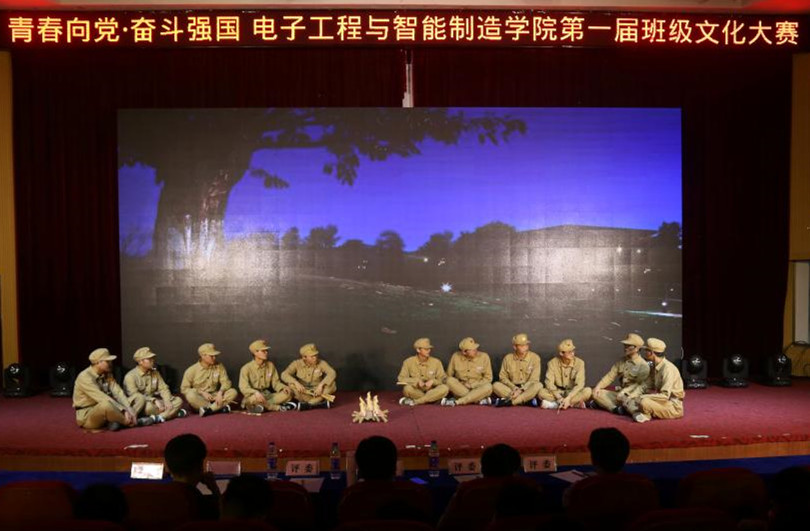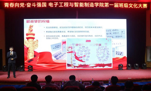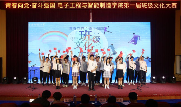 “我和我的祖国一刻也不能分割,无论我走到哪里都流出一首赞歌……”舞台上,34名学生手持五星红旗,齐声唱着《我和我的祖国》。4月29日晚,电子工程与智能制造学院以“青春向党 奋斗强国”为主题举办了第一届班级文化风采大赛,图书馆东厅内党声缭绕。学院党委副书记关德军率300余名师生共同观看了大赛。